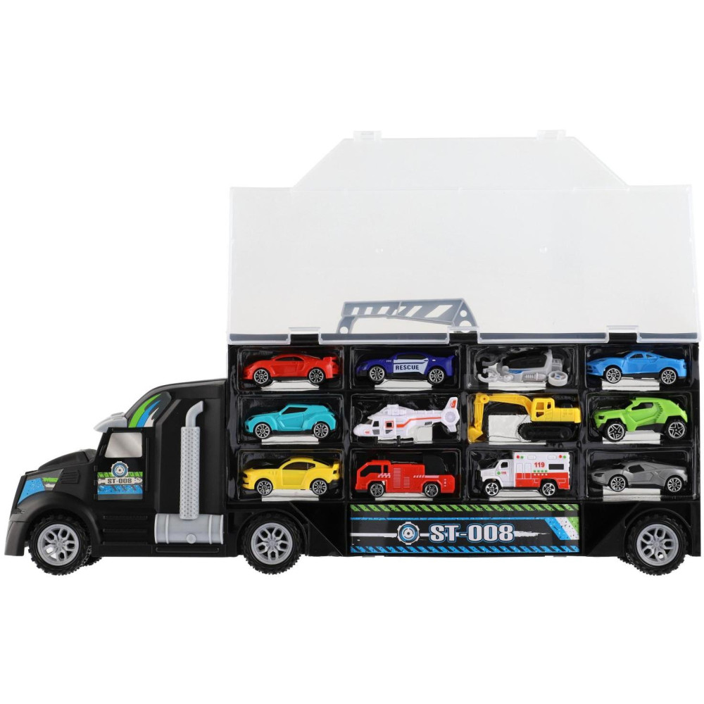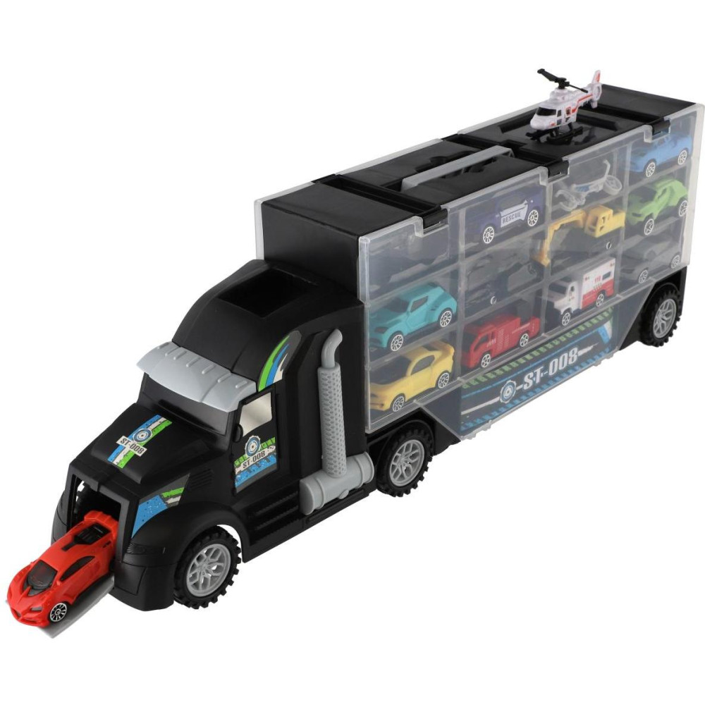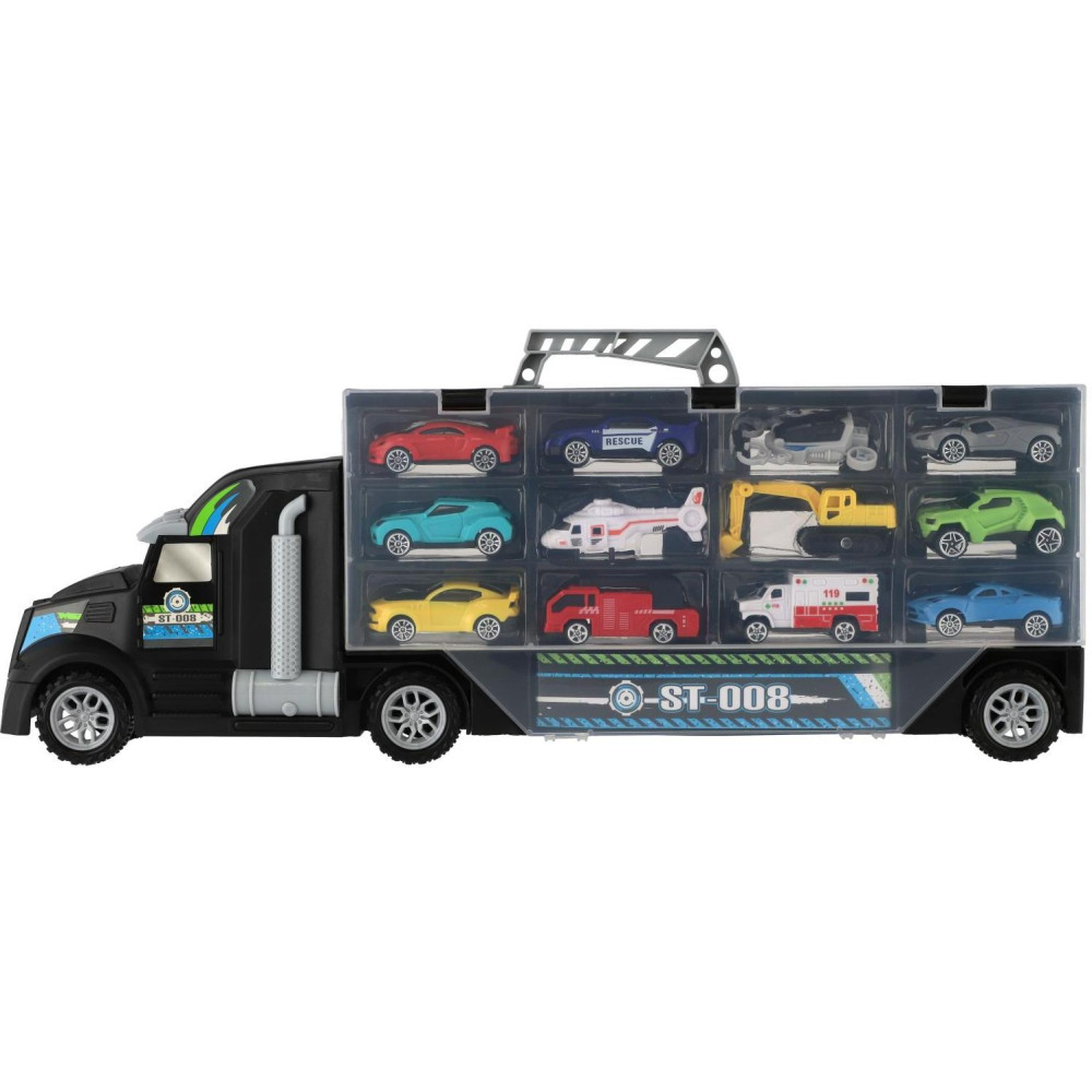 Auto kamion přepravník + dopravní prostředky plast 50cm na volný chod v krabici 51x18x10cm