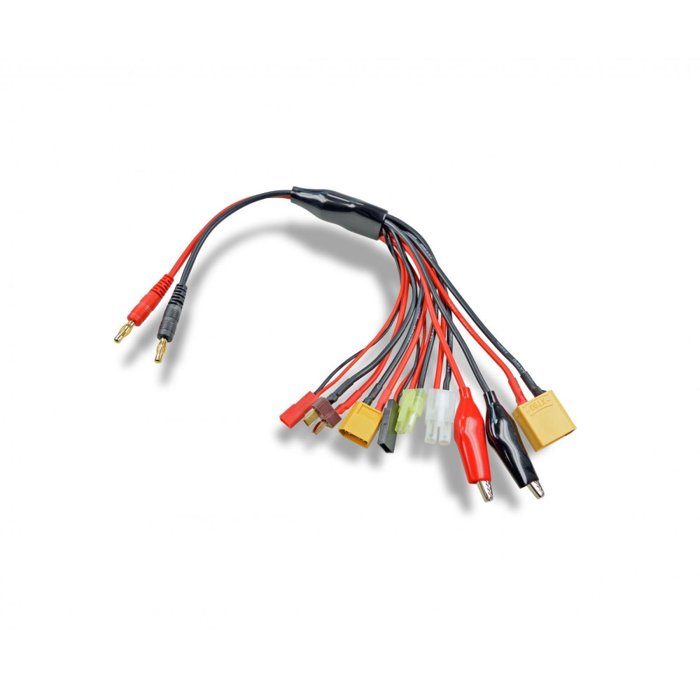 Multifunkční nabíjecí kabel 8 v 1, kombinuje 8 různých konektorů pro nabíjení všech typů baterií s následujícími připojeními: T-Plug, XT90, XT60, Tamiya, Mini Tamiya.