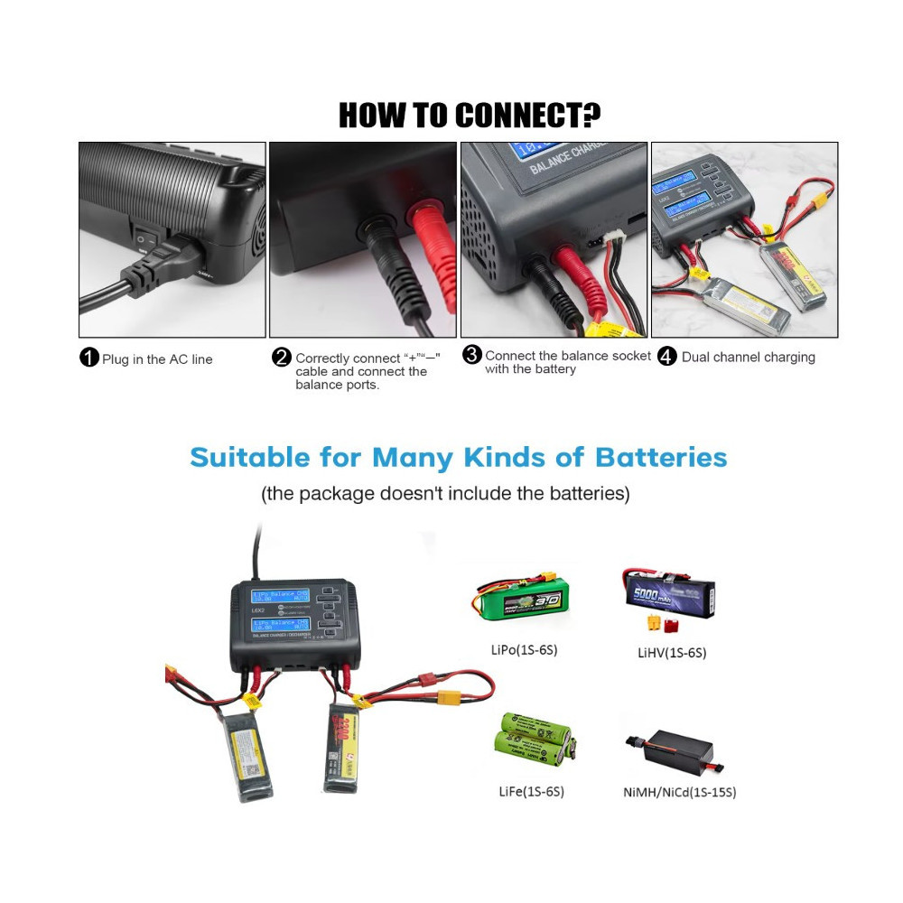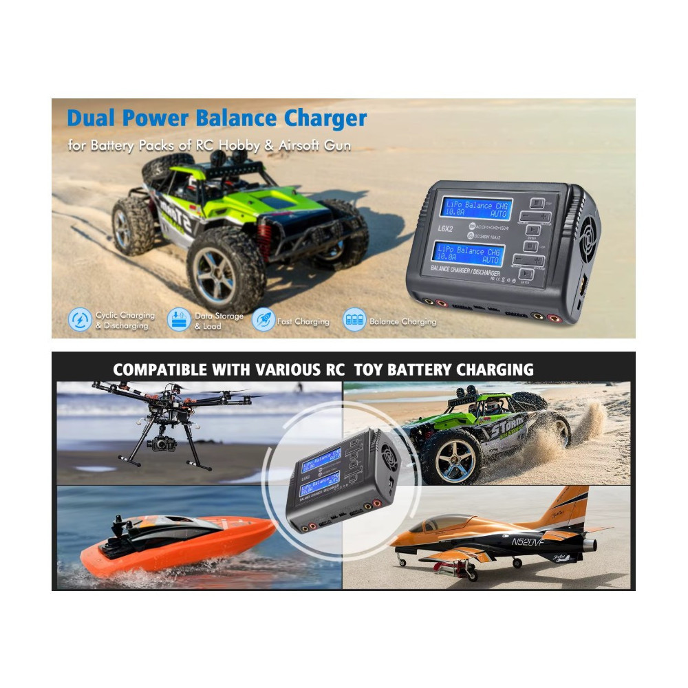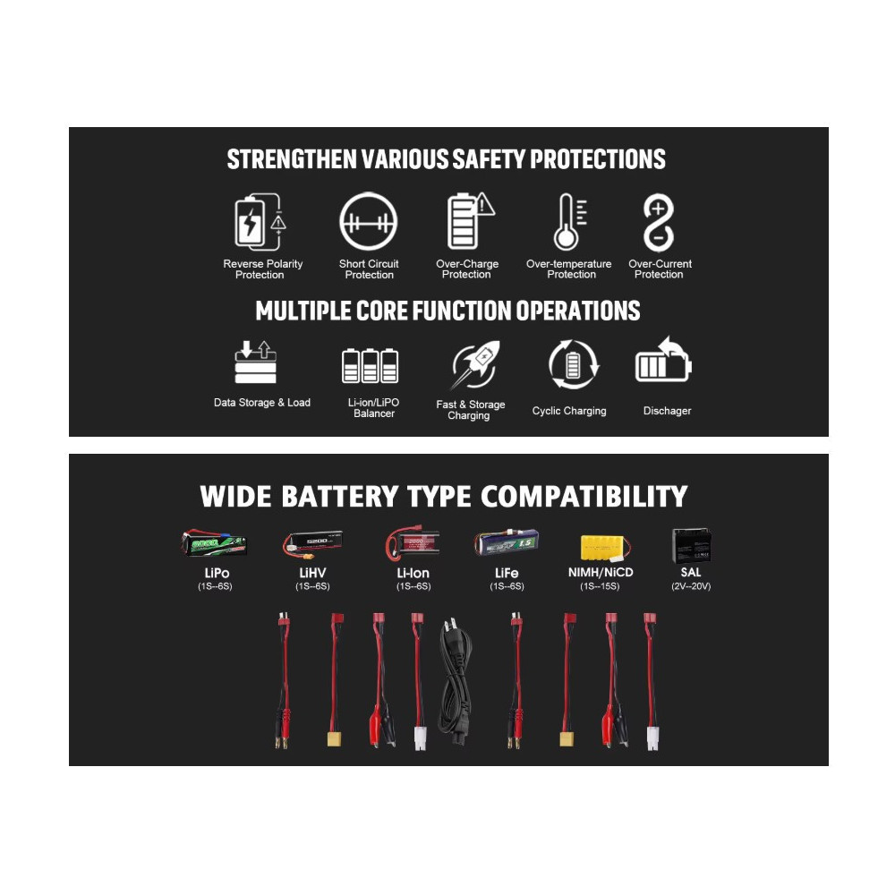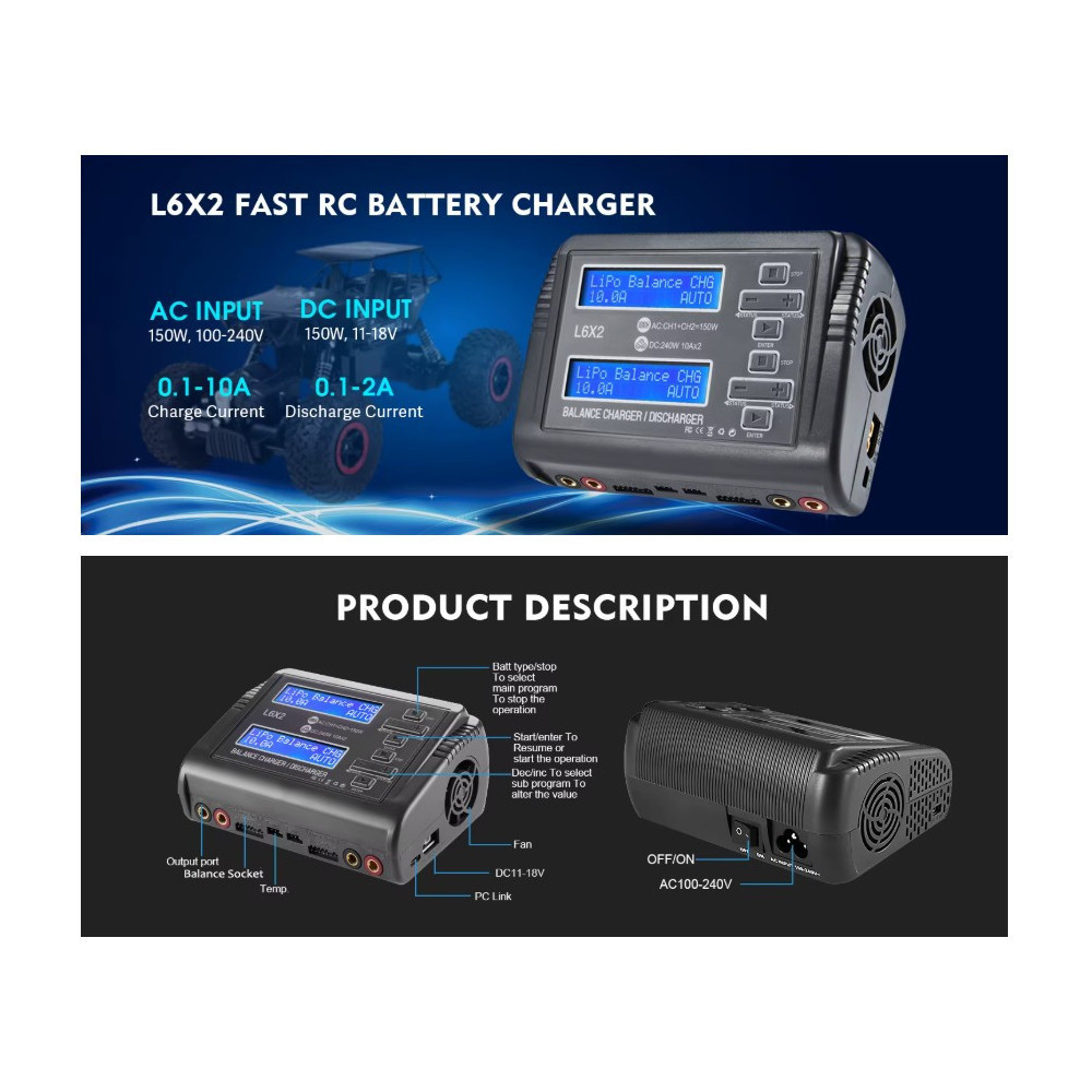 L6X2 AC 150W (Port 1 + Port 2=150W), režim DV - 120W x 2 = 240W, RC Balanční nabíječka pro LiPo LiH LiFe Lilon NiCd NiMh Pb baterie.